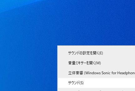 サウンド設定を表示する方法はいろいろありますが、簡単なのはタスクトレイのボリュームのアイコンを右クリック → サウンドから メニューを開けます