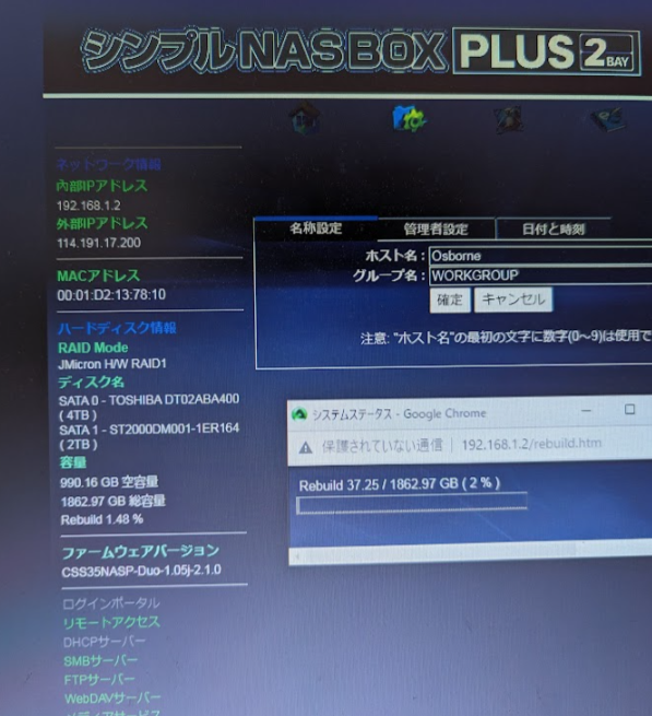 電源を入れて、繋がってるネットワーク内のPCから設定画面を表示し、新しく取り付けたHDDをクリックしたら、既にRAID1でのリビルドが始まっていました。